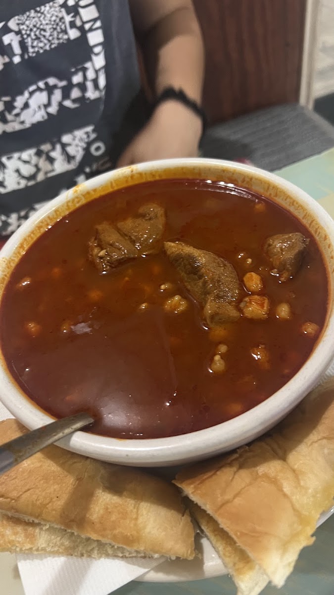 (3) Seasoned beef, chorizo, and bacon with avocado cilantro and fresh onions refried Beans and mexican rice in soft tortillas.