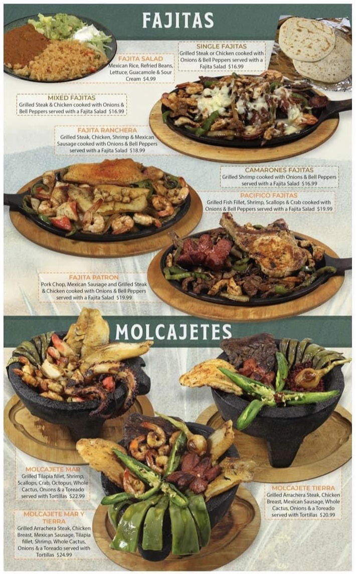 Grilled arrachera steak, chicken breast, Mexican sausage, tilapia fillet, shrimp, whole cactus, onions & a toreado served with a fajita salad & tortillas.